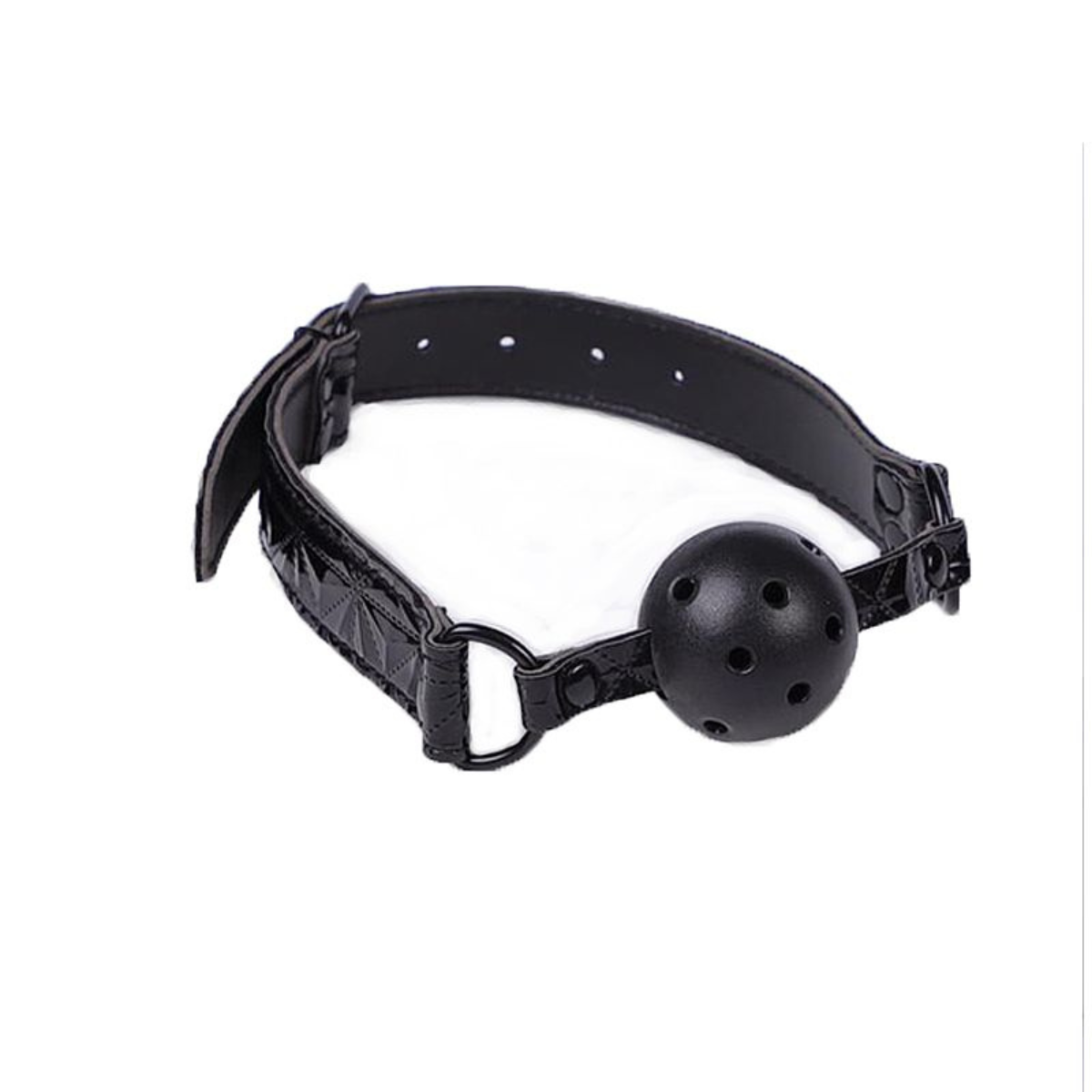 Mordaça bondage ajustável por meio de fivelas metálicas, confeccionada em couro sintético.